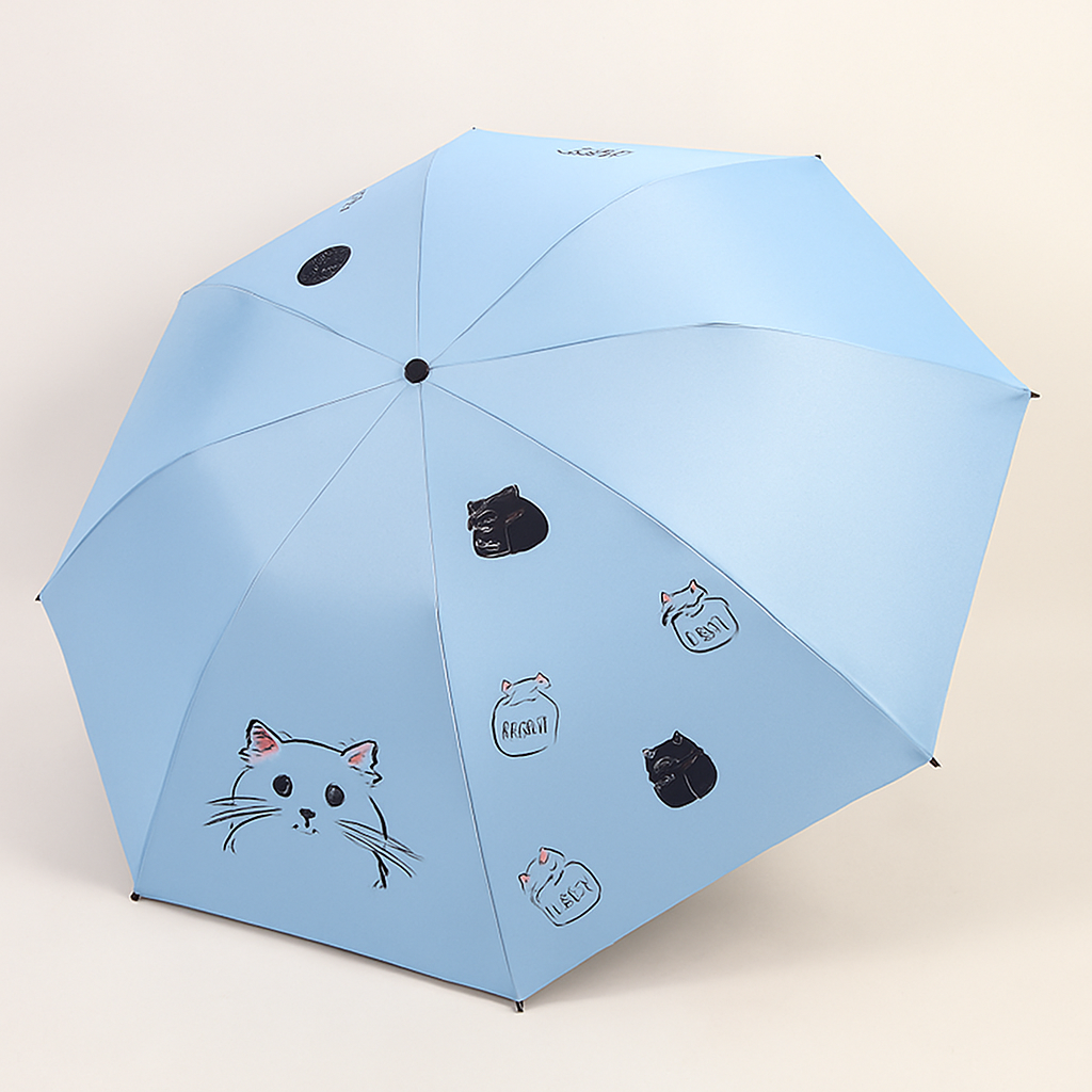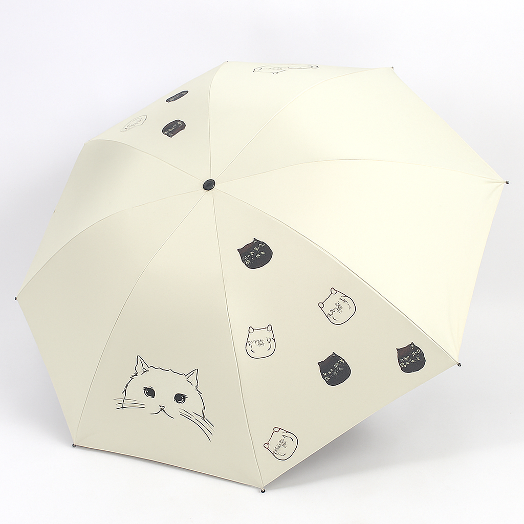 可愛い猫柄がポイントの晴雨兼用日傘です。 紫外線をしっかりカットし、肌老化を防ぎます。 雨の日はもちろん、日傘としても活躍します。 軽量設計で合金親骨を使用し、持ち運びに便利な三段折りたたみ式です。